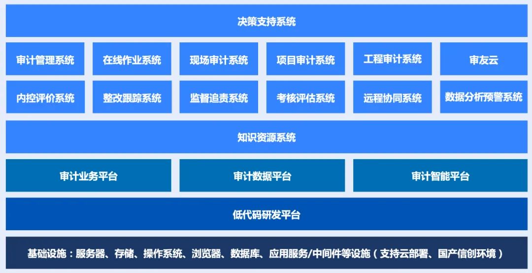 中建材審計系統是基于“審友新一代數智化審計平臺”交付。審友智審平臺為“1+3+N”總體架構模式,包括”1個低代碼研發平臺、3個業務基礎支撐平臺(審計業務平臺、審計數據平臺、審計智能平臺)、N個業務子系統“。具有“整體規劃、分步實施、快速見效、三化融合、可分可合、無縫銜接”的特點。